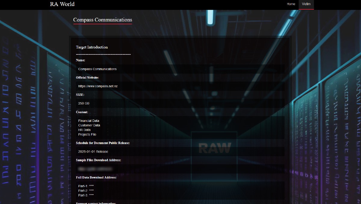 Auckland-based Compass Communications faces a significant cybersecurity incident as the RA World ransomware gang has implicated the company as a victim on its darknet leak platform. The gang alleges that the attack led to the theft of about 250 gigabytes of sensitive internal and customer data.